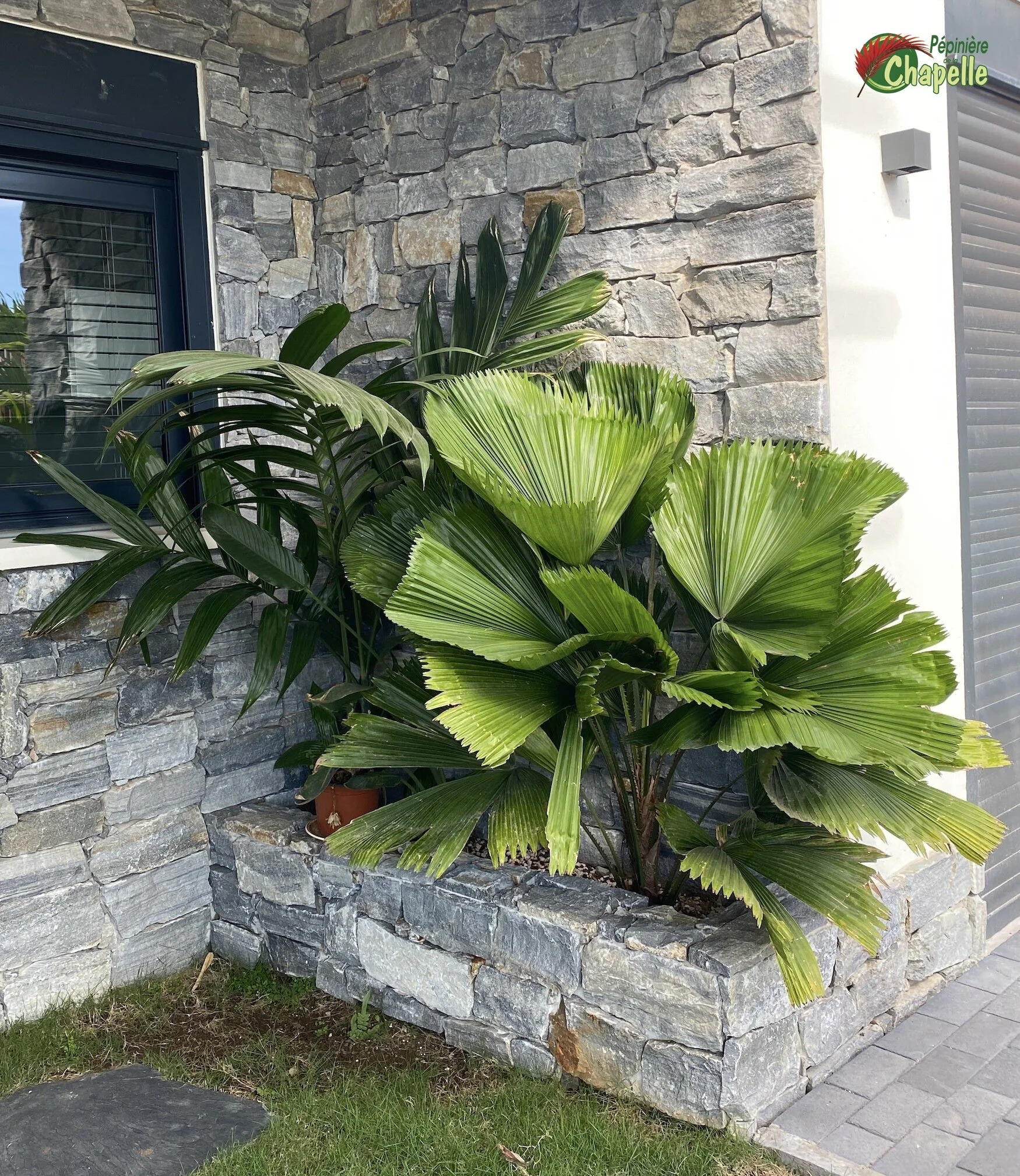 A l’entrée de la maison, se tiennent un Areca triandra et un Licuala grandis (de gauche à droite)