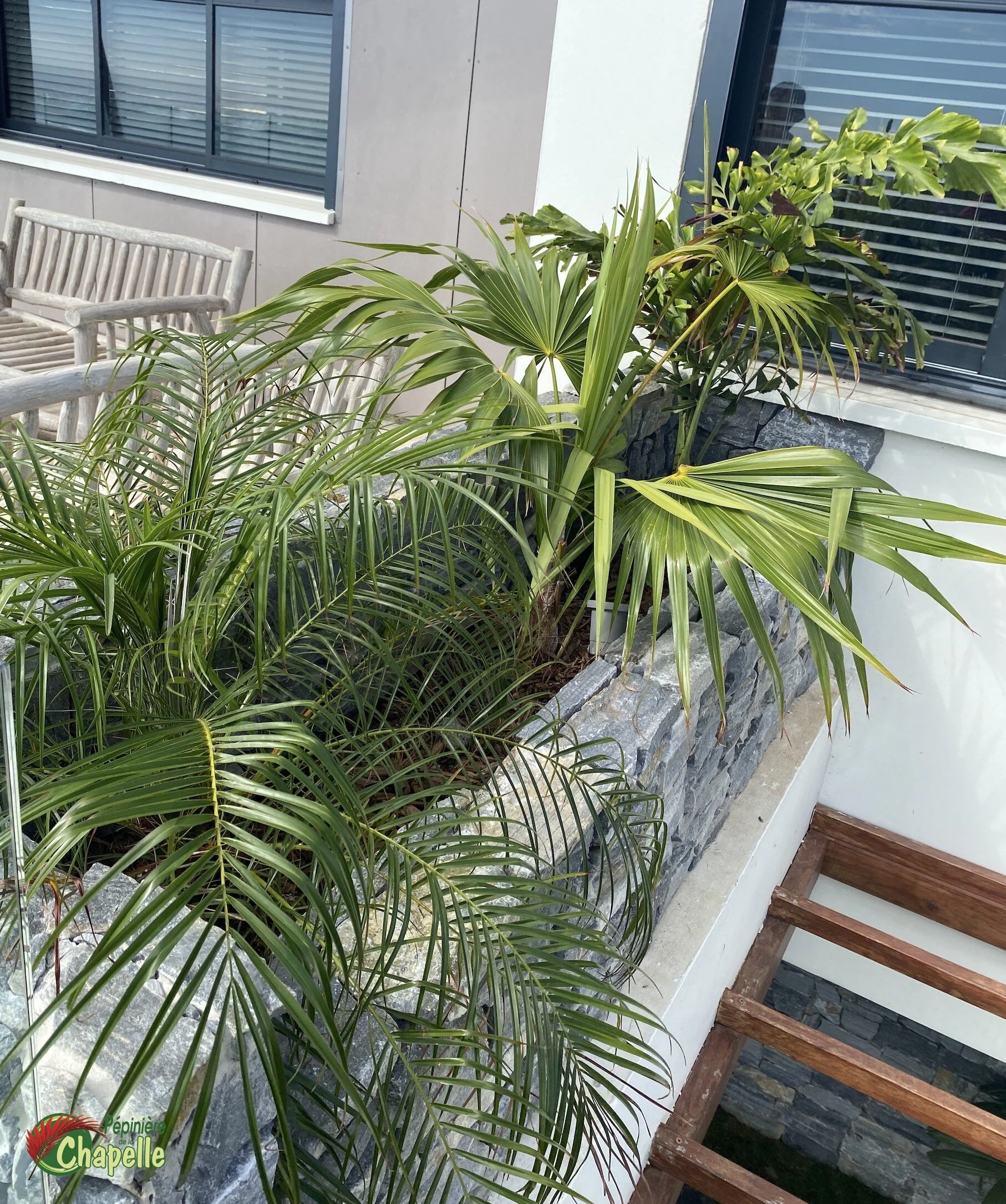 A l’étage, un Phoenix roebelenii, un Thrinax radiata et un Caryota mitis (de gauche à droite) ont été plantés dans une jardinière plus récemment